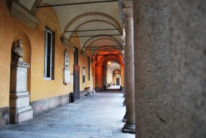 Courtyard and arcade in famous historical Pavia university, Lombardy, Italy